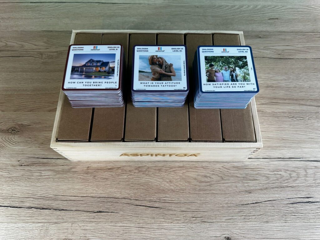 90 karet v každém boxu s pokročilými tématy a frázemi, které jsou běžně používány v komunikaci na úrovni B-B2.